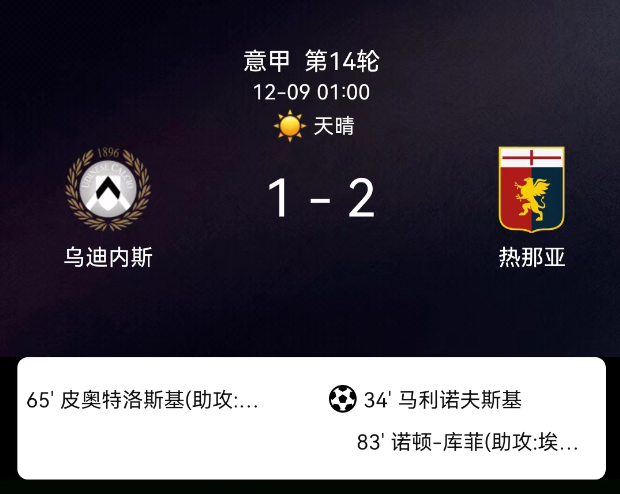 北京时间12月9日,2025-2026赛季意甲第14轮,乌迪内斯主场迎战热那亚。第34分钟马利诺夫斯基点射,0-1;第65分钟皮奥特罗夫斯基破门,1-1;第83分钟诺顿-库菲破门,1-2;双方均无红黄牌。最终比分,乌迪内斯1-2热那亚。