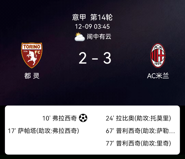 北京时间12月9日3:45,2025-2026赛季意甲第14轮,都灵主场迎战AC米兰。第10分钟弗拉希奇点射,0-1;第17分钟萨帕塔破门,0-2;第24分钟拉比奥世界波,1-2;第67分钟普利希奇破门,2-2;第77分钟普利希奇双响,3-2;都灵1黄、米兰无红黄牌。最终比分,都灵2-3AC米兰。