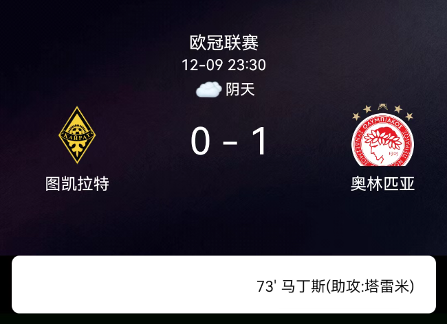北京时间12月10日1:21,2025赛季欧冠联赛第6轮,阿拉木图凯拉特主场迎战奥林匹亚科斯。第73分钟热尔松-马丁斯破门,1-0;双方无红黄牌。最终比分,阿拉木图凯拉特0-1奥林匹亚科斯。