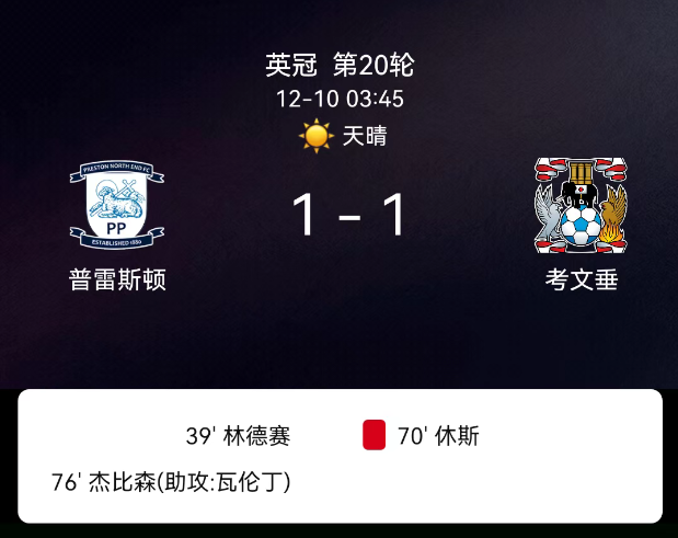 北京时间12月10日,2025-2026赛季英冠第20轮,普雷斯顿主场迎战考文垂。第39分钟林赛染红;第70分钟休斯乌龙,0-1;第76分钟杰比森破门,1-1;考文垂2黄;无其他红牌。最终比分,普雷斯顿1-1考文垂。