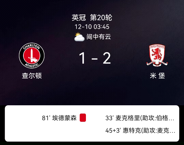 北京时间12月10日,2025-2026赛季英冠第20轮,查尔顿主场迎战米德尔斯堡。第33分钟麦格里破门,0-1;上半场补时3分钟惠特克破门,0-2;第81分钟埃德蒙森乌龙,1-2;查尔顿4黄、米德尔斯堡1黄;无红牌。最终比分,查尔顿1-2米德尔斯堡。