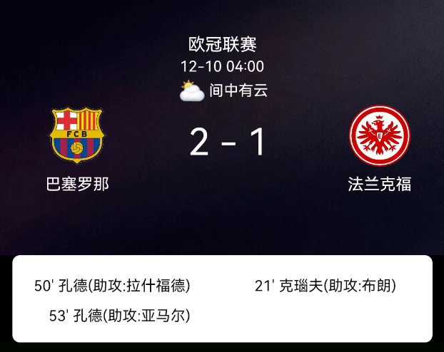 北京时间12月10日4:00,2025-2026赛季欧冠第6轮,巴萨主场迎战法兰克福。第21分钟克瑙夫破门,0-1;第50分钟孔德破门,1-1;第53分钟孔德双响,2-1;亚马尔1黄;无红牌。最终比分,巴塞罗那2-1法兰克福。