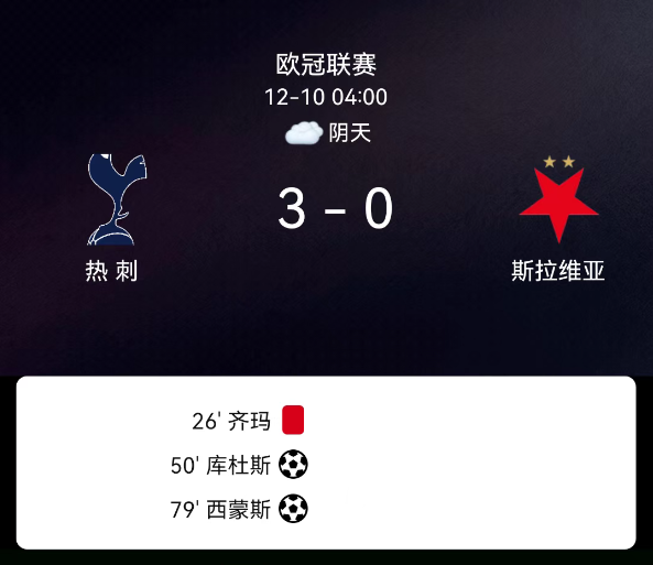 北京时间12月10日4:00,2025赛季欧冠第6轮,热刺主场迎战布拉格斯拉维亚。第26分钟齐马乌龙,1-0;第50分钟库杜斯点射,2-0;第79分钟哈维-西蒙斯点射,3-0;布拉格斯拉维亚1黄、热刺无红黄牌。最终比分,托特纳姆热刺3-0布拉格斯拉维亚。