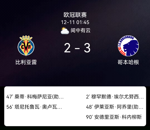 北京时间12月11日4:00,2025赛季欧冠联赛第6轮,比利亚雷亚尔主场迎战哥本哈根。第2分钟埃尔尤努西破门,0-1;第47分钟科梅萨尼亚破门,1-1;第48分钟阿舒里破门,1-2;第56分钟奥卢瓦塞伊破门,2-2;第90分钟科内柳斯破门,2-3;双方各1黄;无红牌。最终比分,比利亚雷亚尔2-3哥本哈根。