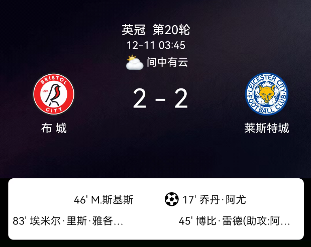 北京时间12月11日3:45,2025-2026赛季英格兰足球冠军联赛第20轮,布里斯托尔城主场对阵莱斯特城。第17分钟乔丹-阿尤点射,0-1;第45分钟德科多瓦-里德破门,0-2;第46分钟赛克斯破门,1-2;第83分钟里斯破门,2-2。双方共5黄,无红牌。最终比分,布里斯托尔城2-2莱斯特城。