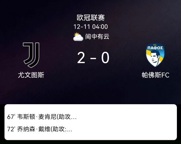 北京时间12月11日4:00,2025赛季欧冠联赛第6轮,尤文图斯主场迎战帕福斯。第67分钟麦肯尼破门,1-0;第73分钟戴维破门,2-0;尤文1黄、帕福斯1黄;无红牌。最终比分,尤文图斯2-0帕福斯。