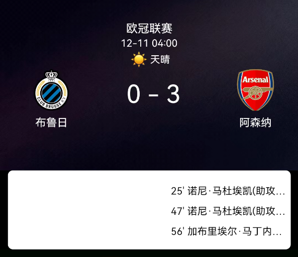 北京时间12月11日4:00,2025赛季欧冠联赛第6轮,阿森纳客战布鲁日。第25分钟马杜埃凯轰世界波,1-0;第47分钟马杜埃凯头球双响,2-0;第56分钟马丁内利世界波,3-0;阿森纳1黄、布鲁日无红黄牌。最终比分,布鲁日0-3阿森纳。