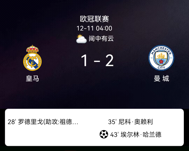北京时间12月11日4:00,2025赛季欧冠联赛第6轮,皇家马德里主场迎战曼城。第28分钟罗德里戈破门,1-0;第35分钟奥赖利补射,1-1;第43分钟哈兰德点射,1-2;曼城3黄、皇马1黄;无红牌。最终比分,皇家马德里1-2曼城。