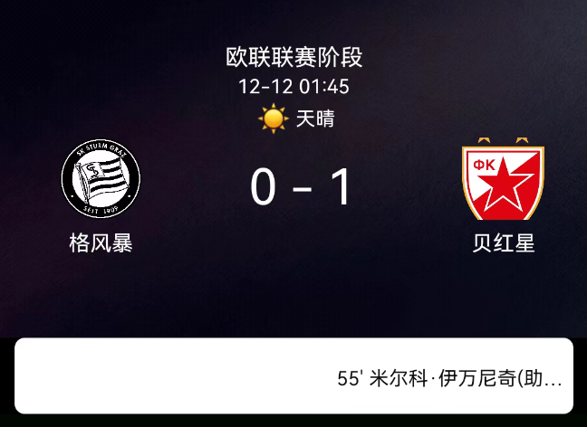 北京时间12月12日01:45,2025赛季欧联联赛第6轮,格拉茨风暴主场迎战贝尔格莱德红星。第55分钟伊万尼奇破门,0-1;格拉茨风暴3黄、贝尔格莱德红星5黄;无红牌。最终比分,格拉茨风暴0-1贝尔格莱德红星。