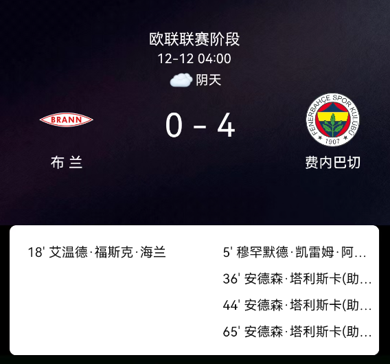 北京时间12月12日01:45,2025赛季欧联联赛联赛阶段第6轮,布兰主场迎战费内巴切。第5分钟阿克蒂尔科奥卢破门,0-1;第36分钟塔利斯卡破门,0-2;第44分钟塔利斯卡破门,0-3;第65分钟塔利斯卡破门,0-4;布兰1红、双方无额外黄牌;无红牌。最终比分,布兰0-4费内巴切。