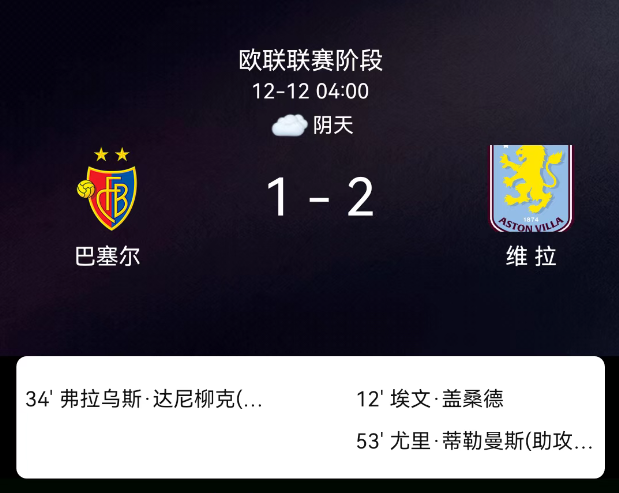 北京时间12月12日04:00,2025赛季欧联联赛联赛阶段第6轮,巴塞尔主场对阵阿斯顿维拉。第12分钟盖桑破门,0-1;第34分钟达尼柳克破门,1-1;第53分钟蒂勒曼斯破门,1-2;巴塞尔1黄、维拉无黄牌;无红牌。最终比分,巴塞尔1-2阿斯顿维拉。