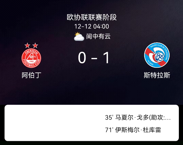 北京时间12月12日,2025赛季欧洲协会联赛联赛阶段第5轮,阿伯丁主场对阵斯特拉斯堡。第35分钟戈多破门,0-1;双方各1黄;无红牌。最终比分,阿伯丁0-1斯特拉斯堡。