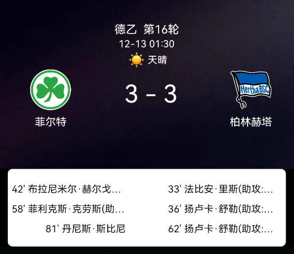 北京时间12月13日,2025赛季德国足球乙级联赛第16轮,菲尔特主场对阵柏林赫塔。第33分钟里泽破门,0-1;第36分钟舒勒破门,0-2;第42分钟赫尔戈塔破门,1-2;第58分钟克劳斯破门,2-2;第62分钟舒勒破门,2-3;第81分钟斯尔贝尼破门,3-3;双方各2黄;无红牌。最终比分,菲尔特3-3柏林赫塔。