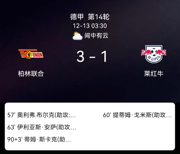 北京时间12月13日,2025赛季德国足球甲级联赛第14轮,柏林联合主场对阵RB莱比锡。第57分钟伯克破门,1-0;第60分钟蒂迪亚姆-戈米破门,1-1;第63分钟安萨破门,2-1;补时第3分钟斯卡克破门,3-1;双方各2黄;无红牌。最终比分,柏林联合3-1RB莱比锡。