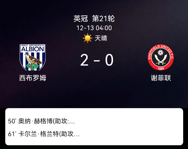 北京时间12月13日,2025赛季英格兰足球冠军联赛第21轮,西布朗主场对阵谢菲尔德联。第50分钟赫格贝破门,1-0;第61分钟卡尔兰-格兰特破门,2-0;双方各1黄;无红牌。最终比分,西布朗2-0谢菲尔德联。