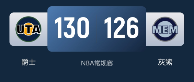 NBA常规赛战报:爵士130-126逆转灰熊终结2连败乔治39+8创生涯新高莫兰特复出21+10空砍