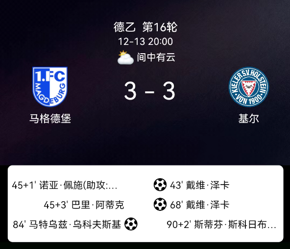 北京时间12月13日,2025赛季德国足球乙级联赛第16轮,马格德堡主场对阵荷尔斯泰因基尔。第43分钟泽茨点球破门,0-1;补时1分钟佩施破门,1-1;补时3分钟巴里斯-阿提克破门,2-1;第68分钟泽茨点球双响,2-2;第84分钟茹科夫斯基点球破门,3-2;补时2分钟斯科日布斯基破门,3-3;双方各3黄;无红牌。最终比分,马格德堡3-3荷尔斯泰因基尔。