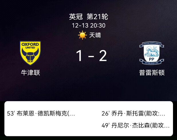 北京时间12月13日,2025赛季英格兰足球冠军联赛第21轮,牛津联主场对阵普雷斯顿。第26分钟乔丹-斯托里破门,0-1;第49分钟杰比森破门,0-2;第53分钟克尔斯马克破门,1-2;双方各1黄;无红牌。最终比分,牛津联1-2普雷斯顿。