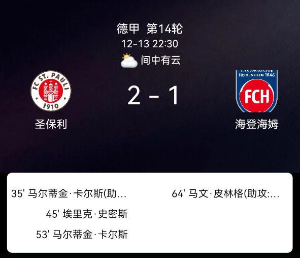 北京时间12月13日,2025赛季德国足球甲级联赛第14轮,圣保利主场对阵海登海姆。第35分钟卡尔斯破门,1-0;第45分钟埃里克-史密斯染红;第53分钟卡尔斯双响,2-0;第64分钟派林格破门,2-1;圣保利1红2黄、海登海姆1黄;无其他红牌。最终比分,圣保利2-1海登海姆。
