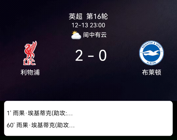 北京时间12月13日,2025赛季英格兰足球超级联赛第16轮,利物浦主场对阵布莱顿。第1分钟埃基蒂克破门,1-0;第60分钟埃基蒂克双响,2-0;布莱顿1黄、利物浦0黄;无红牌。最终比分,利物浦2-0布莱顿。