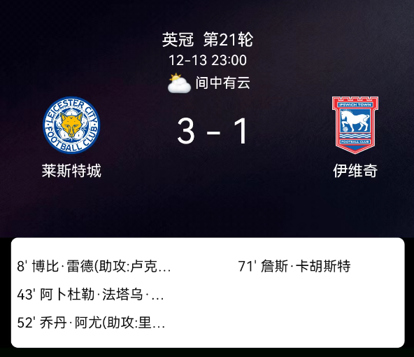 北京时间12月13日,2025赛季英格兰足球冠军联赛第21轮,莱斯特城主场对阵伊普斯维奇。第8分钟德科多瓦-里德破门,1-0;第43分钟法塔武破门,2-0;第52分钟乔丹-阿尤破门,3-0;第71分钟卡尤斯特破门,3-1;莱斯特城1黄、伊普斯维奇1黄;无红牌。最终比分,莱斯特城3-1伊普斯维奇。