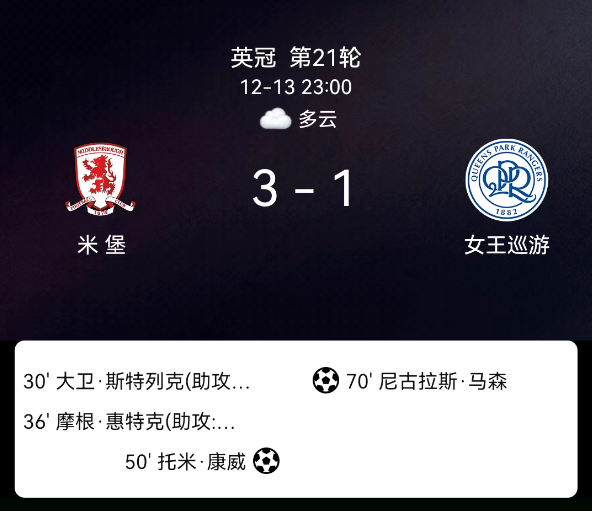 北京时间12月13日,2025赛季英格兰足球冠军联赛第21轮,米德尔斯堡主场对阵女王公园巡游者。第30分钟斯特雷莱茨破门,1-0;第36分钟惠特克破门,2-0;第50分钟康韦点球命中,3-0;第70分钟尼古拉斯-马森点球破门,3-1;米德尔斯堡1黄、女王公园0黄;无红牌。最终比分,米德尔斯堡3-1女王公园巡游者。