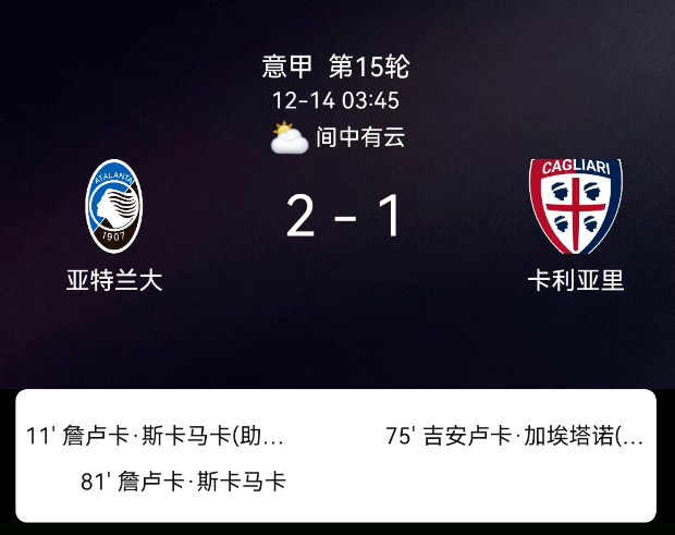北京时间12月14日,2025赛季意大利足球甲级联赛第15轮,亚特兰大主场对阵卡利亚里。第11分钟斯卡马卡破门,1-0;第75分钟加埃塔诺破门,1-1;第81分钟斯卡马卡双响,2-1;亚特兰大1黄、卡利亚里2黄;无红牌。最终比分,亚特兰大2-1卡利亚里。
