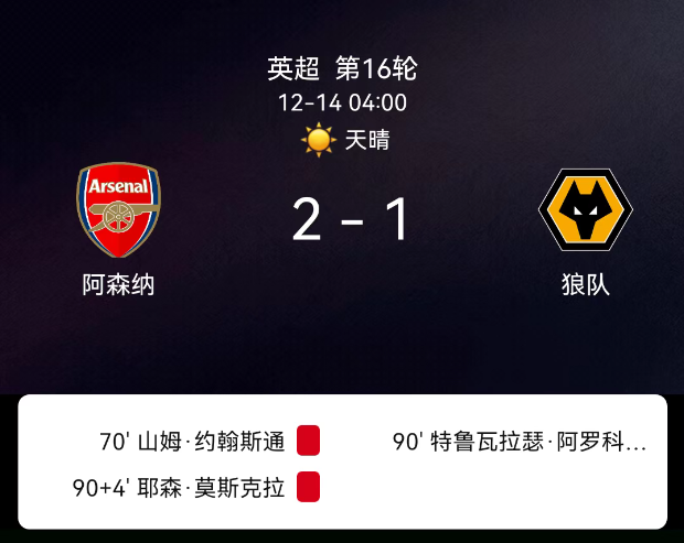 北京时间12月14日,2025赛季英格兰足球超级联赛第16轮,阿森纳主场对阵狼队。第71分钟萨卡角球造门将乌龙,1-0;第90分钟阿罗科达雷破门,1-1;第90+4分钟萨卡传中造莫斯克拉乌龙,2-1;狼队4黄、阿森纳0黄;无红牌。最终比分,阿森纳2-1狼队。