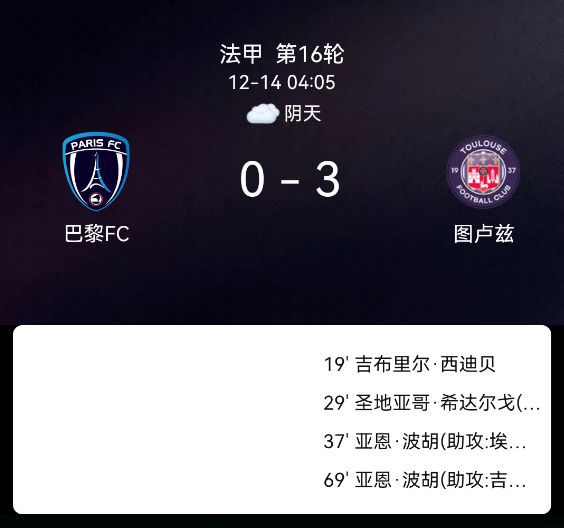 北京时间12月14日,2025赛季法国足球甲级联赛第16轮,巴黎FC主场对阵图卢兹。第29分钟圣地亚哥-伊达尔戈破门,0-1;第37分钟格博霍破门,0-2;第69分钟格博霍双响,0-3;图卢兹1黄、巴黎FC2黄;无红牌。最终比分,巴黎FC0-3图卢兹。