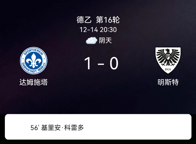 北京时间12月14日,2025赛季德国足球乙级联赛第16轮,达姆施塔特98主场对阵明斯特普鲁士。第56分钟科雷多破门,1-0;达姆施塔特981黄、明斯特普鲁士2黄;无红牌。最终比分,达姆施塔特981-0明斯特普鲁士。