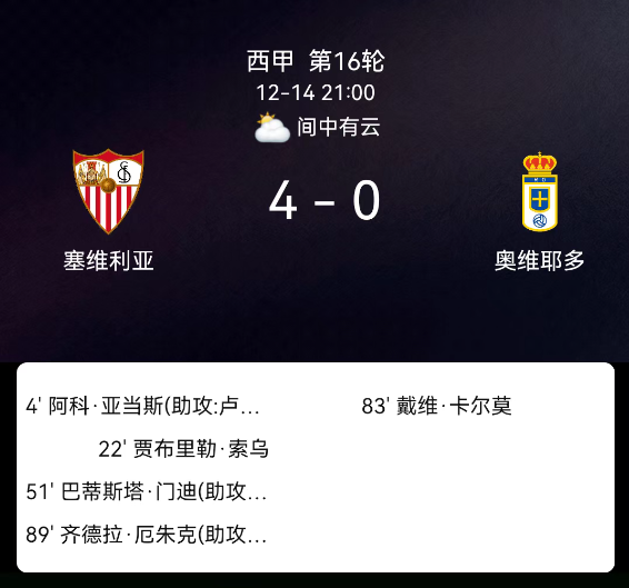 北京时间12月14日,2025赛季西班牙足球甲级联赛第16轮,塞维利亚主场对阵皇家奥维耶多。第4分钟阿科-亚当斯破门,1-0;第22分钟索乌破门,2-0;第51分钟巴蒂斯塔-门迪破门,3-0;第89分钟埃朱克破门,4-0;塞维利亚1黄、皇家奥维耶多2黄1红;戴维-卡尔莫染红。最终比分,塞维利亚4-0皇家奥维耶多。