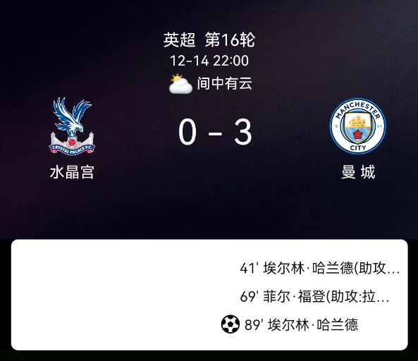 北京时间12月14日,2025赛季英格兰足球超级联赛第16轮,曼城客场挑战水晶宫。第41分钟哈兰德头球破门,1-0;第69分钟福登贴地斩建功,2-0;第89分钟哈兰德点射双响,3-0;水晶宫2黄、曼城0黄;无红牌。最终比分,水晶宫0-3曼城。