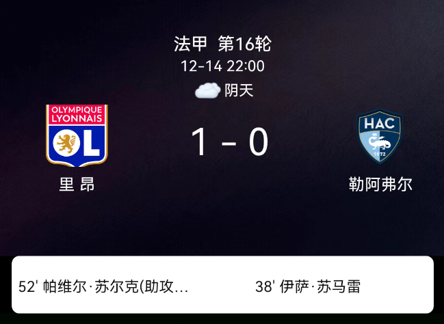 北京时间12月14日,2025赛季法国足球甲级联赛第16轮,里昂主场对阵勒阿弗尔。第52分钟舒尔茨破门,1-0;里昂1黄、勒阿弗尔2黄;无红牌。最终比分,里昂1-0勒阿弗尔。