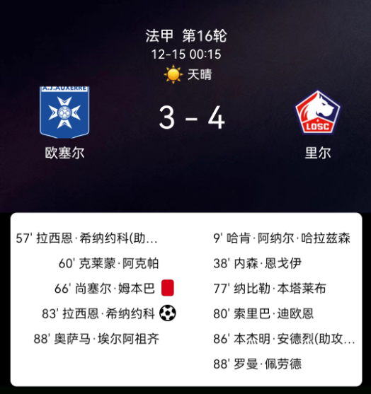 北京时间12月15日,2025赛季法国足球甲级联赛第16轮,欧塞尔主场对阵里尔。第9分钟哈康-哈拉尔德松破门,0-1;第57分钟西纳约科破门,1-1;第66分钟姆本巴乌龙,2-1;第77分钟本塔莱布破门,2-2;第80分钟迪奥内破门,2-3;第83分钟西纳约科双响,3-3;第86分钟邦雅曼-安德烈绝杀,3-4;双方各2红,欧塞尔1黄、里尔2黄;最终比分,欧塞尔3-4里尔。