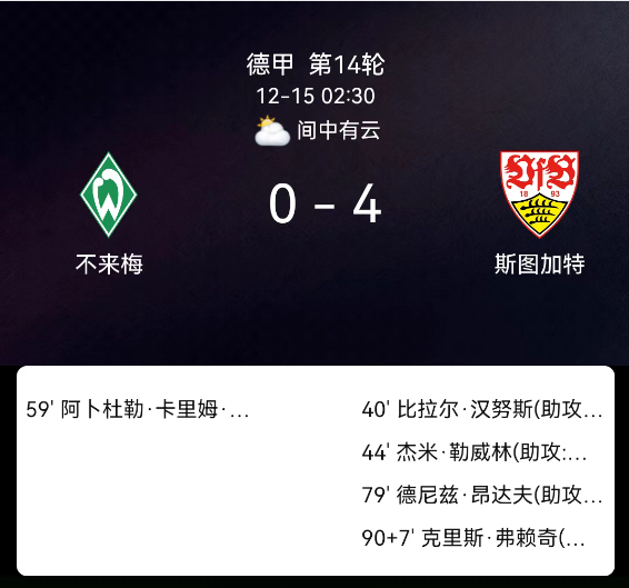 北京时间12月15日,2023-2024赛季德国足球甲级联赛第14轮,云达不莱梅主场对阵斯图加特。第40分钟哈努斯破门,0-1;第44分钟莱韦林破门,0-2;第59分钟库利巴利染红,不莱梅10人作战;第79分钟昂达夫破门,0-3;补时第7分钟菲里希破门,0-4;不莱梅3黄1红、斯图加特2黄;最终比分,云达不莱梅0-4斯图加特。