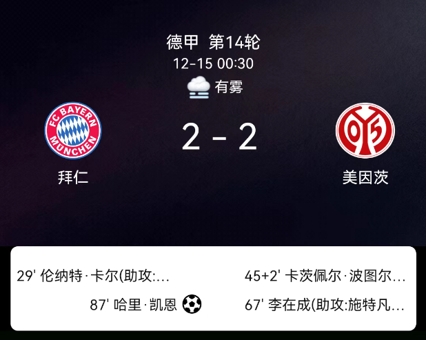 北京时间12月15日,2025赛季德国足球甲级联赛第14轮,拜仁慕尼黑主场对阵美因茨。第29分钟卡尔破门,1-0;第45+2分钟波图尔斯基头球扳平,1-1;第67分钟李在成头球反超,1-2;第87分钟凯恩点射绝平,2-2;拜仁2黄、美因茨2黄;无红牌。最终比分,拜仁慕尼黑2-2美因茨。