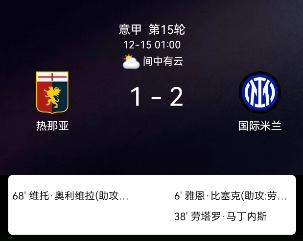 北京时间12月15日,2025赛季意大利足球甲级联赛第15轮,国际米兰客场挑战热那亚。第6分钟比塞克闪击破门,0-1;第38分钟劳塔罗建功,0-2;第68分钟维蒂尼亚扳回一城,1-2;国米1黄、热那亚0黄;无红牌。最终比分,热那亚1-2国际米兰。