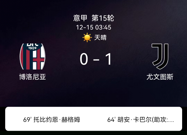 北京时间12月15日,2025赛季意大利足球甲级联赛第15轮,博洛尼亚主场对阵尤文图斯。第65分钟卡瓦尔头槌破门,0-1;第71分钟黑格姆直红被罚下,博洛尼亚10人作战;博洛尼亚3黄1红、尤文1黄;最终比分,博洛尼亚0-1尤文图斯。