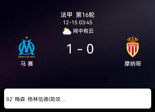 北京时间12月15日,2025赛季法国足球甲级联赛第16轮,马赛主场对阵摩纳哥。第51分钟卡马拉进球因巴洛贡越位干扰被吹;第80分钟巴洛贡越位进球无效;第82分钟格林伍德破门,1-0;马赛1黄、摩纳哥2黄;无红牌。最终比分,马赛1-0摩纳哥。