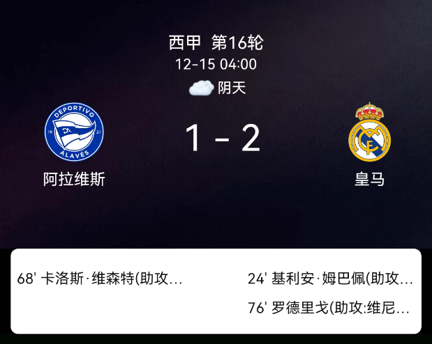 北京时间12月15日,2025赛季西班牙足球甲级联赛第16轮,阿拉维斯主场对阵皇家马德里。第24分钟姆巴佩内切破门,0-1;第68分钟比森特单刀扳平,1-1;第76分钟罗德里戈推射制胜,1-2;阿拉维斯2黄、皇马1黄;无红牌。最终比分,阿拉维斯1-2皇家马德里。