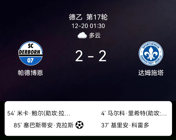 北京时间12月20日01:30,2025赛季德国足球乙级联赛第17轮,帕德博恩主场对阵达姆施塔特98。第4分钟里希特破门,0-1;第37分钟科雷多建功,0-2;第54分钟米卡-鲍尔扳回一球,1-2;第85分钟克拉斯点球破门,2-2;双方无红黄牌。最终比分,帕德博恩2-2达姆施塔特98。