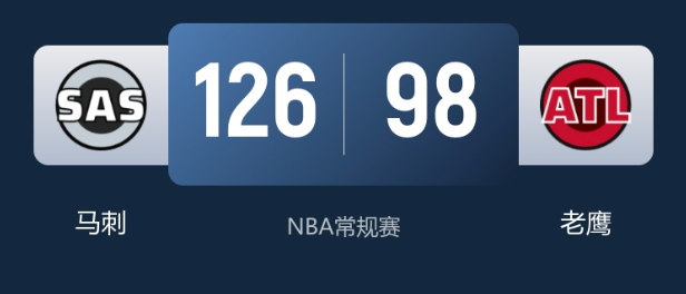NBA常规赛战报:文班21分钟26+12统治攻防马刺126-98大胜老鹰豪取5连胜瓦塞尔18+7卡斯尔17+7助约翰逊17+11+6空砍