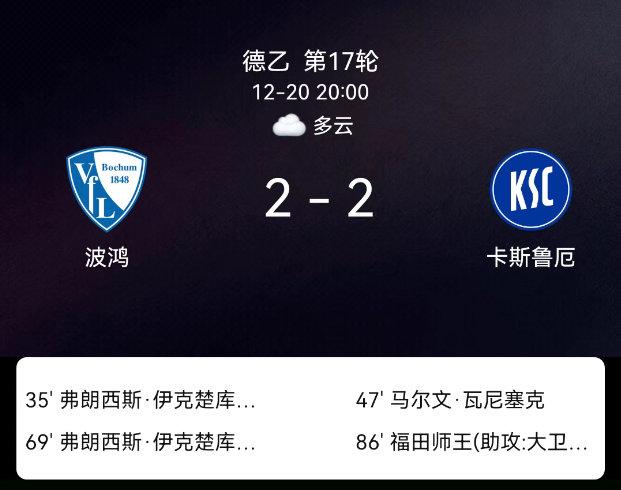 北京时间12月20日,2025赛季德国足球乙级联赛第17轮,波鸿主场对阵卡尔斯鲁厄。第35分钟奥涅卡破门,1-0;第47分钟瓦尼切克扳平,1-1;第69分钟奥涅卡再入一球,2-1;第58分钟、68分钟波鸿各得1黄;第86分钟福田师王绝平,2-2;卡尔斯鲁厄无黄牌;无红牌。最终比分,波鸿2-2卡尔斯鲁厄。