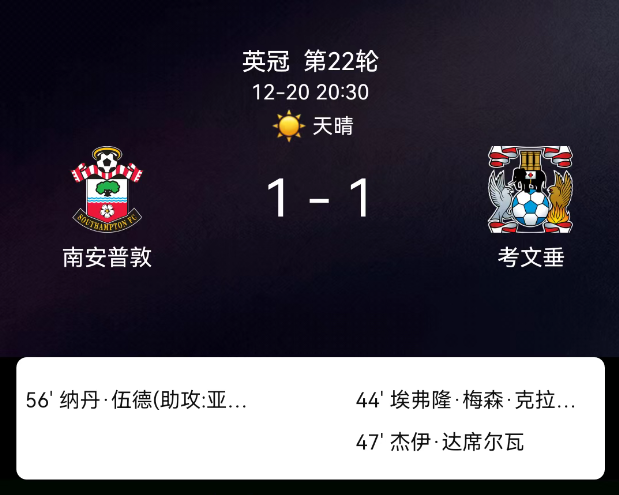 北京时间12月20日,2025赛季英格兰足球冠军联赛第22轮,南安普顿主场对阵考文垂。第44分钟梅森-克拉克破门,0-1;第47分钟杰伊-达席尔瓦染红;第56分钟内森-伍德扳平,1-1;考文垂1红、双方各1黄;最终比分,南安普顿1-1考文垂。