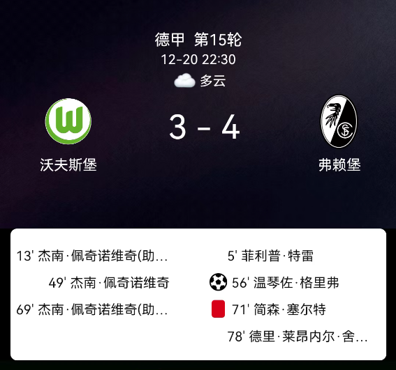 北京时间12月20日,2025赛季德国足球甲级联赛第15轮,沃尔夫斯堡主场对阵弗赖堡。第5分钟菲利普-特罗伊破门,0-1;第13分钟佩契诺维奇扳平,1-1;第49分钟佩契诺维奇反超,2-1;第56分钟格里福点射,2-2;第69分钟佩契诺维奇戴帽,3-2;第71分钟塞尔特自摆乌龙,3-3;第78分钟舍尔汉特绝杀,3-4;第82分钟沃尔夫斯堡领黄,第84分钟弗赖堡领黄;无红牌。最终比分,沃尔夫斯堡3-4弗赖堡。