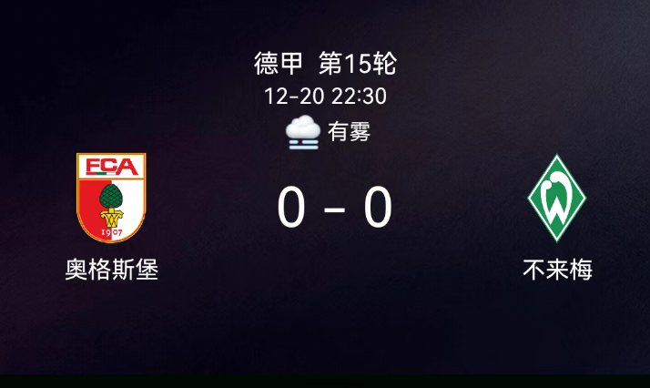 北京时间12月20日,2025赛季德国足球甲级联赛第15轮,奥格斯堡主场对阵云达不莱梅。半场补时阶段双方各领1黄;下半场多人染黄,累计7张黄牌;施密德错失关键得分机会;双方无进球;最终比分,奥格斯堡0-0云达不莱梅。