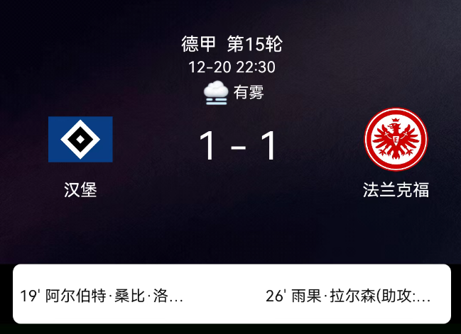 北京时间12月20日,2025赛季德国足球甲级联赛第15轮,汉堡主场对阵法兰克福。第18分钟洛孔加低射破门,1-0;第26分钟胡戈-拉松铲射扳平,1-1;双方无红黄牌;最终比分,汉堡1-1法兰克福。