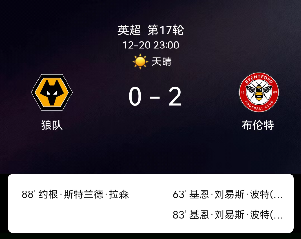 北京时间12月20日,2025赛季英格兰足球超级联赛第17轮,狼队主场对阵布伦特福德。第19分钟布伦特福德领首黄;第44分钟双方各添1黄;第62分钟刘易斯-波特破门,0-1;第83分钟其梅开二度,0-2;第88分钟凯莱赫扑出拉森点球;布伦特福德4黄、狼队2黄;无红牌。最终比分,狼队0-2布伦特福德。
