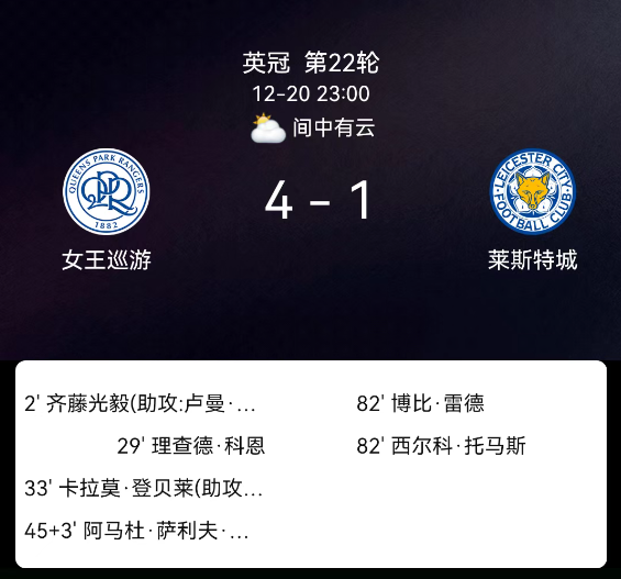 北京时间12月20日,2025赛季英格兰足球冠军联赛第22轮,女王公园巡游者主场对阵莱斯特城。第2分钟齐藤光毅破门,1-0;第29分钟里夏尔-科内建功,2-0;第33分钟卡拉莫科-登贝莱破门,3-0;补时第3分钟阿马杜-姆本格头球得分,4-0;第82分钟西尔科-托马斯扳回一城,4-1;莱斯特城2黄、女王公园1黄;无红牌。最终比分,女王公园巡游者4-1莱斯特城。