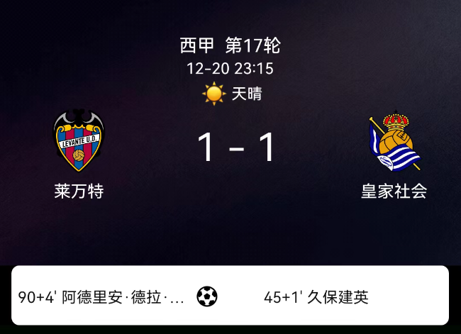 北京时间12月20日,2025赛季西班牙足球甲级联赛第17轮,莱万特主场对阵皇家社会。上半场补时第1分钟久保建英破门,0-1;下半场补时第4分钟阿德里安-德拉富恩特点球扳平,1-1;双方各2黄;无红牌。最终比分,莱万特1-1皇家社会。